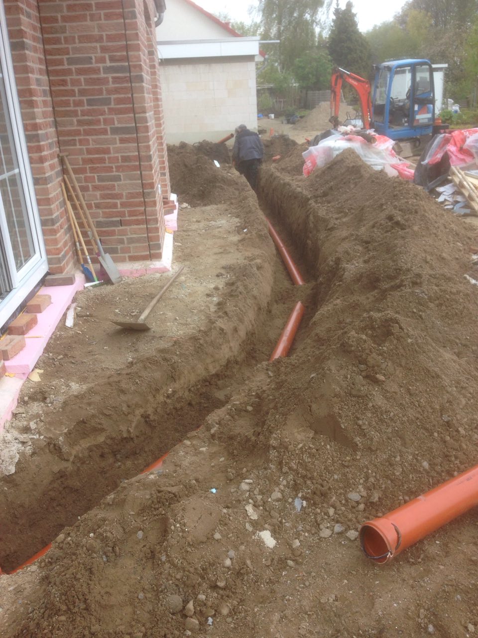 Hat man alle Vorbereitungen getroffen und Genehmigungen eingeholt, kann man sich anschließend der tatsächlichen Drainage widmen. Nachdem die Drainage geplant ist, wird der Graben entsprechend ausgehoben. Auf den Boden kommt dann eine Schicht von Sickerkies, die sich zwischen 15 und 20 Zentimeter bewegt. In den Kies werden die Drainagerohre gebettet. Wichtig ist hier, dass man auf ein Gefälle von 1,5 bis 2 Prozent achtet, damit das Wasser auch wirklich abläuft. Bei jeder Richtungsänderung sollte zudem ein T-Stück und einen Drainageschacht verbaut werden. Durch die Schächte kann man die Drainage später auf Verunreinigungen überprüfen und reinigen.